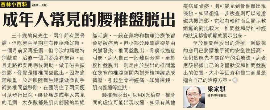 三十歲的何先生,兩年前有腰骨痛,但吃藥兩星期左右便逐漸好轉。一個月前又再扭傷,但今次的痛楚特別嚴重,治療一個月都沒有起色,而且走路都要用枴杖輔助。做了磁共振造影,發覺是腰椎間盤脫出。因為痛楚嚴重,於是跟隨醫生建議做微創手術將椎間盤移除,在醫院住了兩天便可以步行出院。腰背痛是成年人常見的毛病,大多數都是肌肉筋腱的軟組織毛病,一般在藥物和物理治療後都會紓緩痊愈。但小部分腰背痛卻是由內臟發炎、椎間盤脫出、骨癆或癌症引起,病人自己一般難以分辨。至於腰椎盤脫出,則是由於脫出的椎間盤在狹窄的椎腔空間內對脊椎神經造成擠壓,引起坐骨神經痛、知覺遲鈍、肌肉萎縮等症狀。