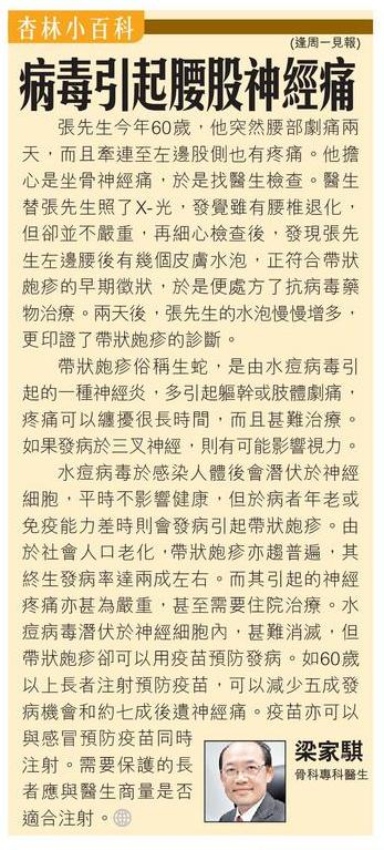水痘病毒於感染人體後會潛伏於神經細胞,平時不影響健康,但於病者年老或免疫能力差時則會發病引起帶狀皰疹。由於社會人口老化, 帶狀皰疹亦趨普遍,其終生發病率達兩成左右。而其引起的神經疼痛亦甚為嚴重,甚至需要住院治療。水痘病毒潛伏於神經細胞內,甚難消滅,但帶狀皰疹卻可以用疫苗預防發病。如60歲以上長者注射預防疫苗,可以減少五成發病機會和約七成後遺神經痛。疫苗亦可以與感冒預防疫苗同時注射。需要保護的長者應與醫生商量是否適合注射。